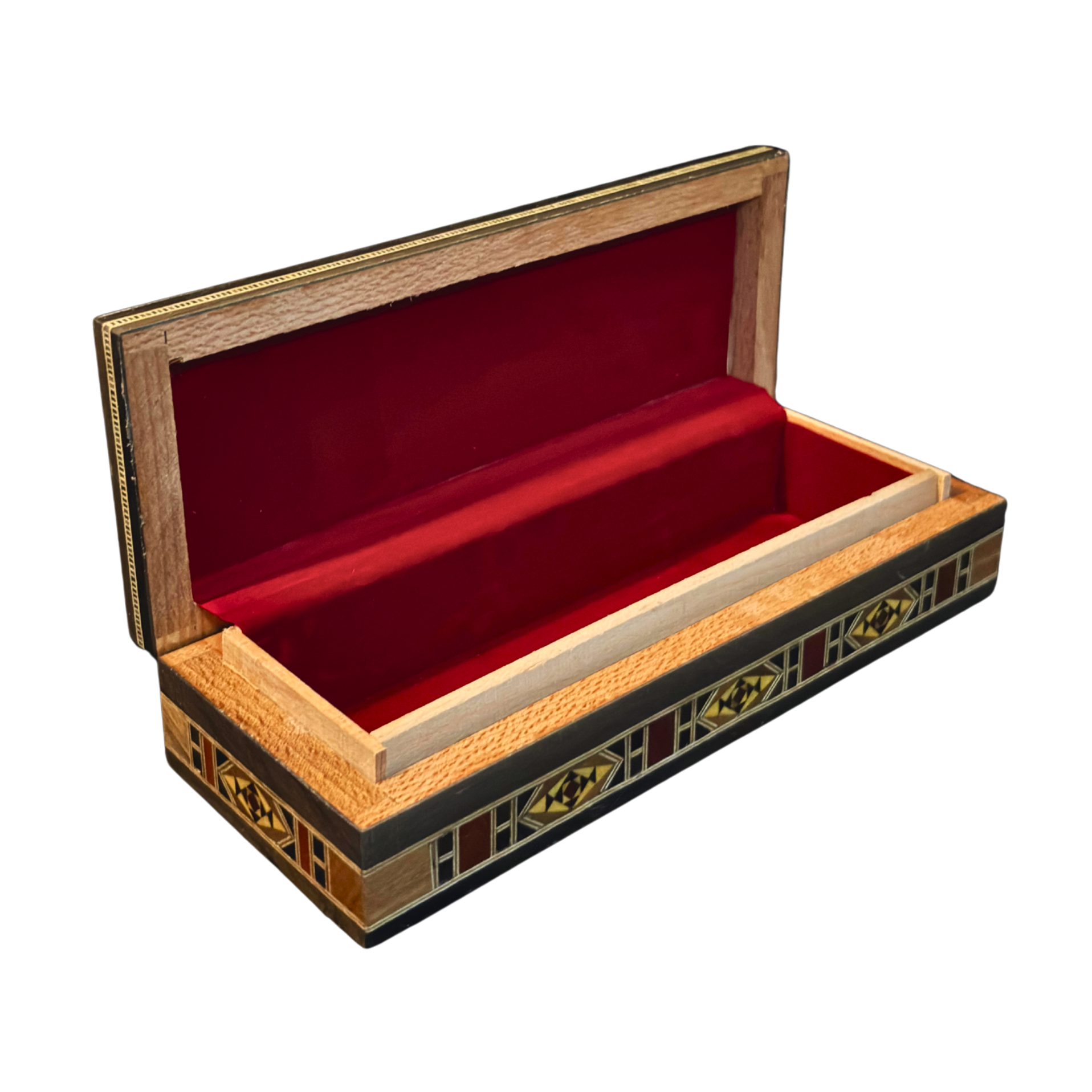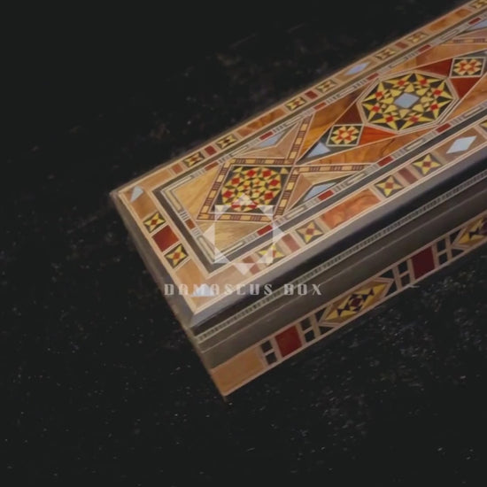 Decora tu espacio con esta impresionante caja de mosaico damasquino, cuidadosamente elaborada a mano en una forma rectangular y alargada que combina lo práctico con lo artístico. Fabricada con madera de nogal, haya, limón y pino amarillo, e incrustada con nácar auténtico, esta pieza presenta patrones geométricos inspirados en el arte tradicional sirio.