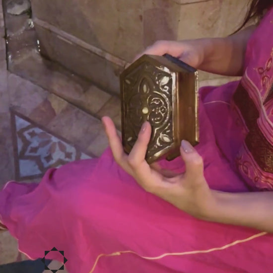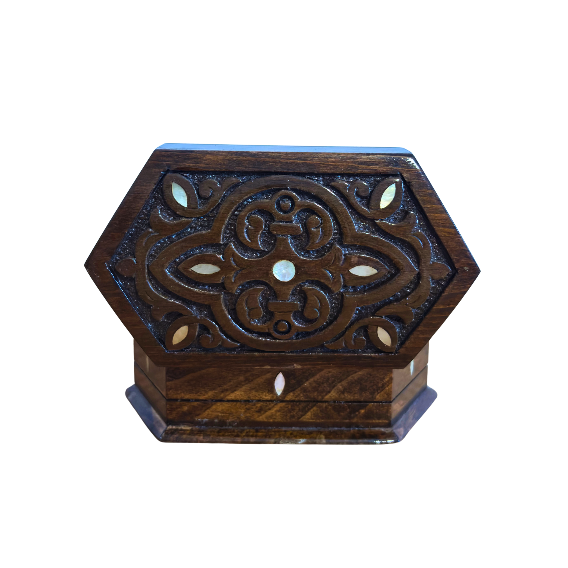 Questa elegante scatola damaschina in legno si distingue per il suo intaglio a mano e per i raffinati motivi orientali che raccontano la tradizione artigianale siriana.