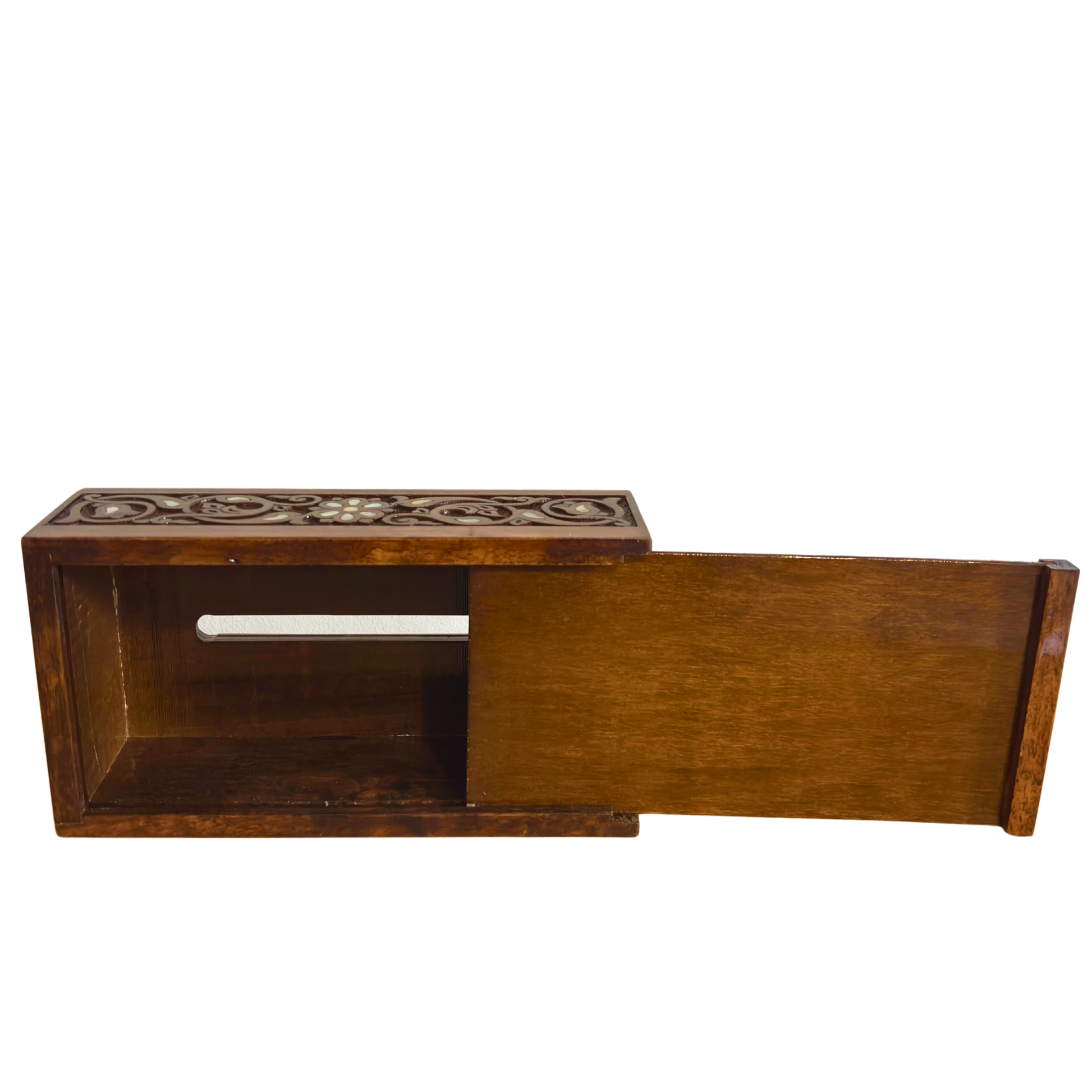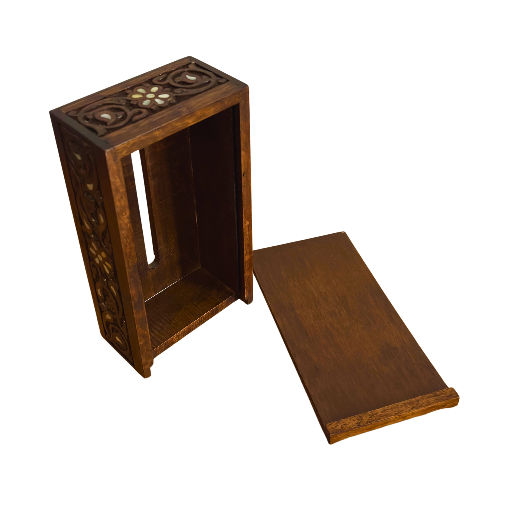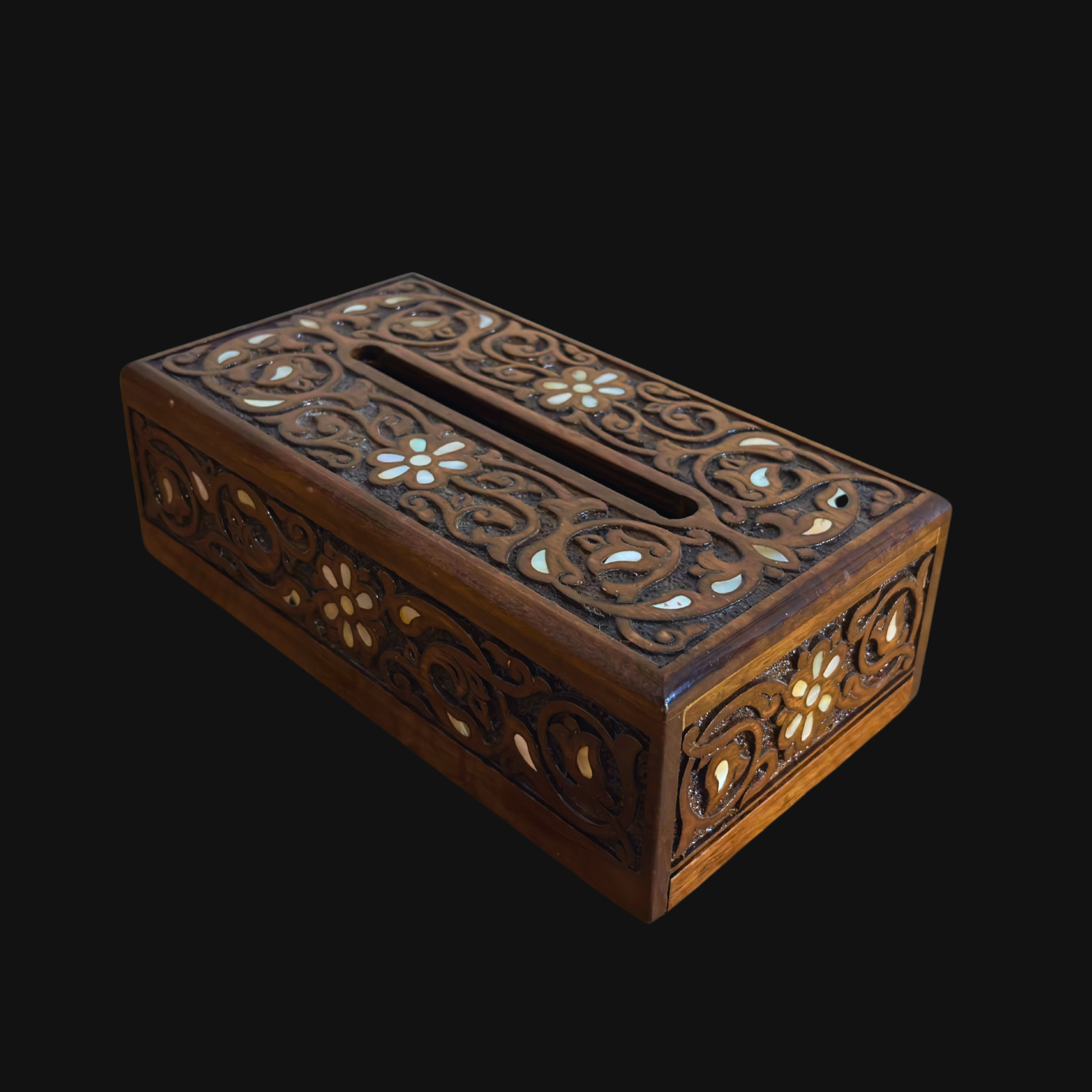 Portafazzoletti in Faggio Intagliato a Mano con Madreperla – Finitura Noce Elegante