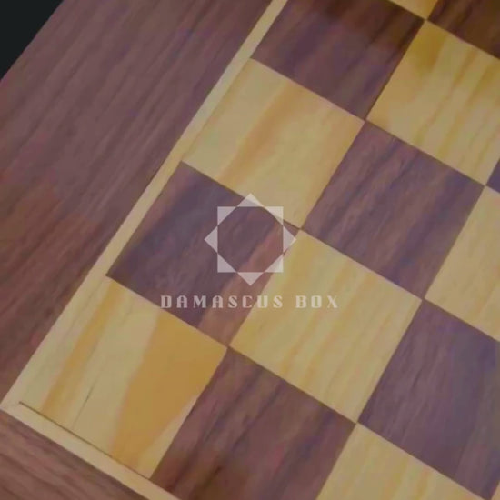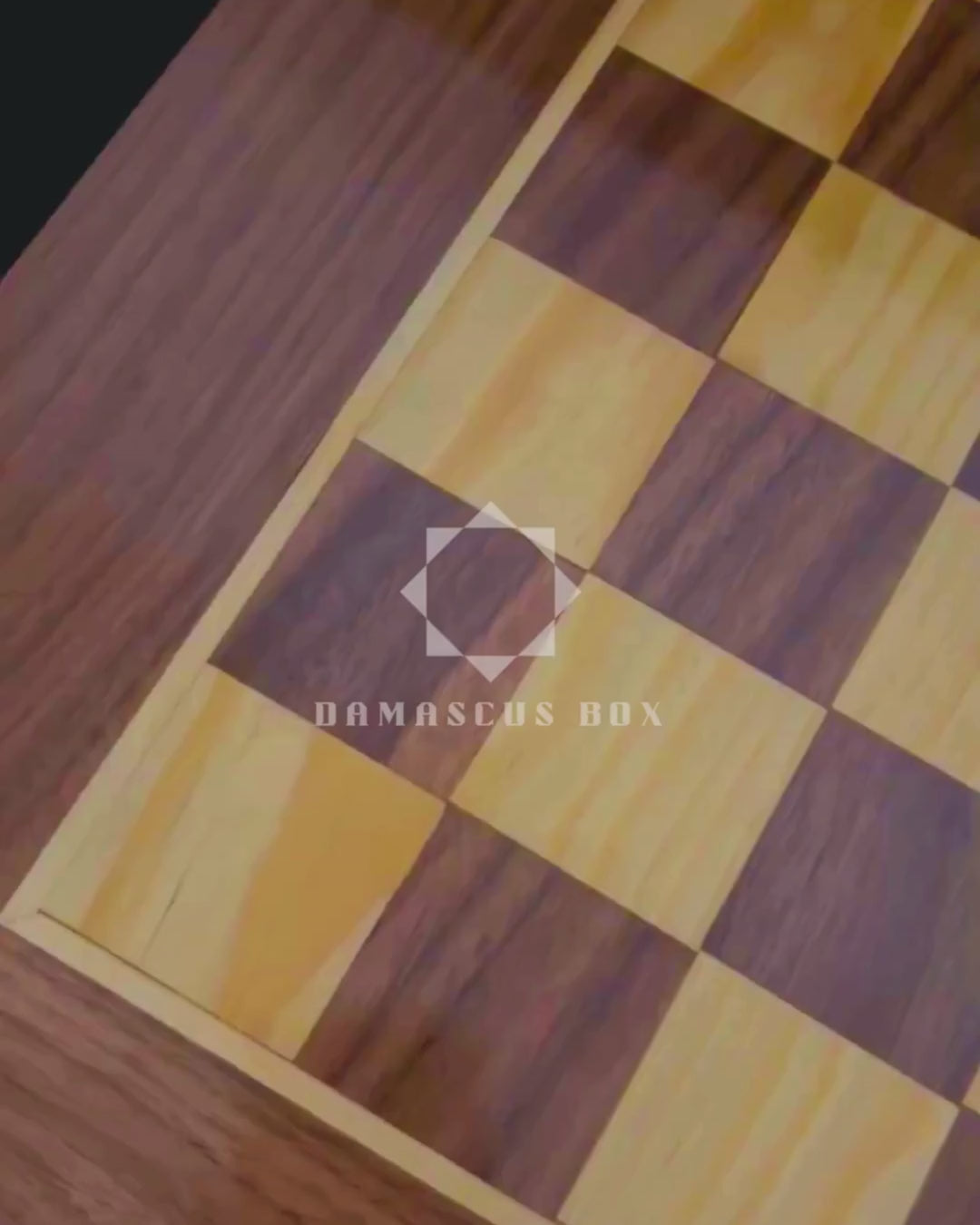 Het oppervlak vertoont een klassiek schaakbordpatroon, terwijl de binnenzijde een prachtig Damasceens mozaïek — een eerbetoon aan eeuwenoude kunsttradities.