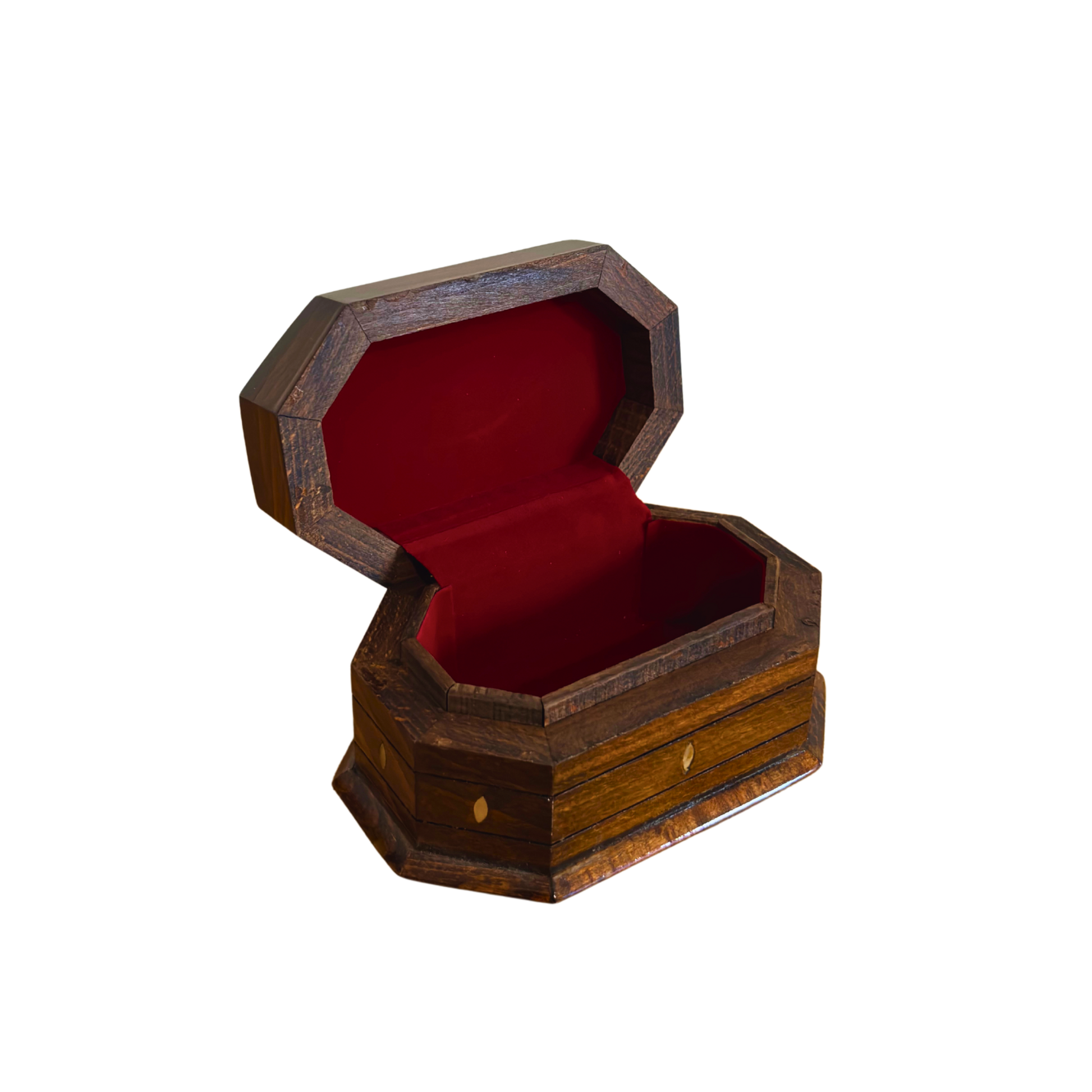 O interior é forrado com veludo vermelho vinho, oferecendo elegância e proteção aos seus objetos preciosos.