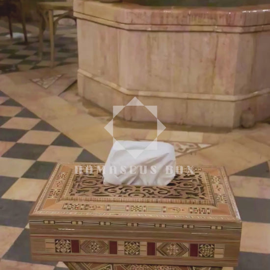 This elegant handcrafted tissue box reflects the timeless artistry of Damascus woodwork.